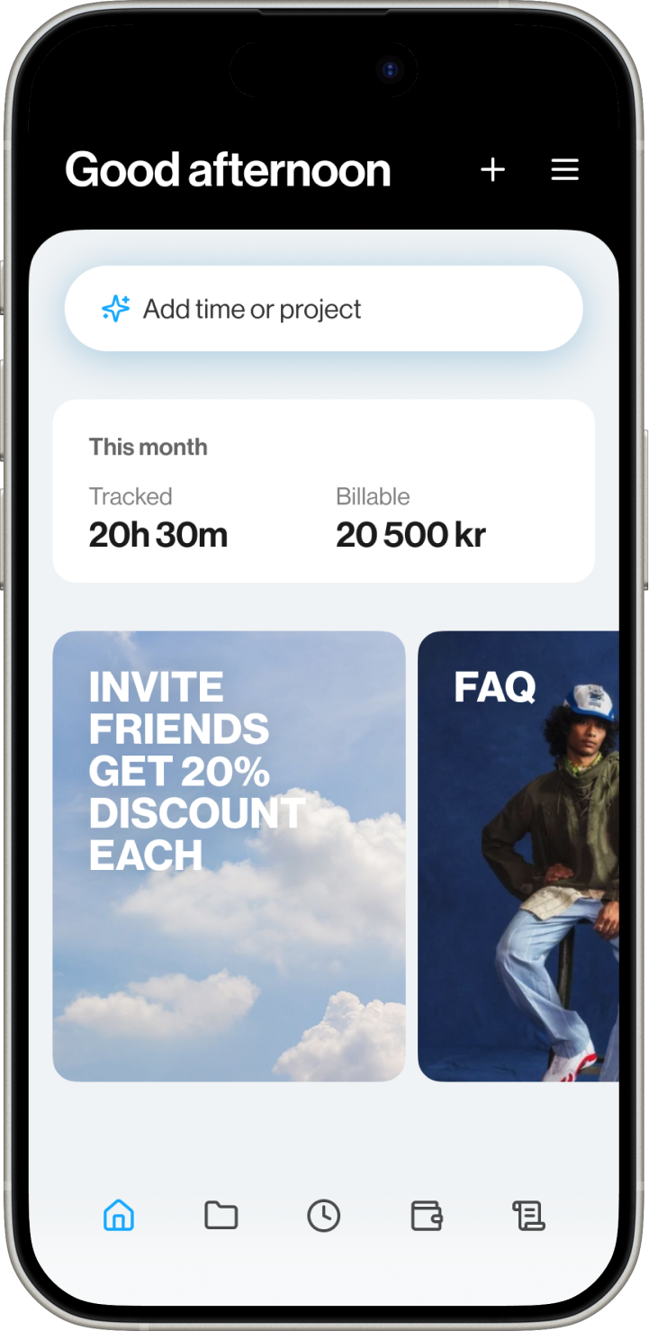 Samla uppdrag, hantera utlägg för olika kunder, skicka fakturor utifrån redovisad tid eller projekt och automatisera bokföringen. Allt med AI-drivna arbetsflöden som avlastar dig i rollen som frilansande egenföretagare.